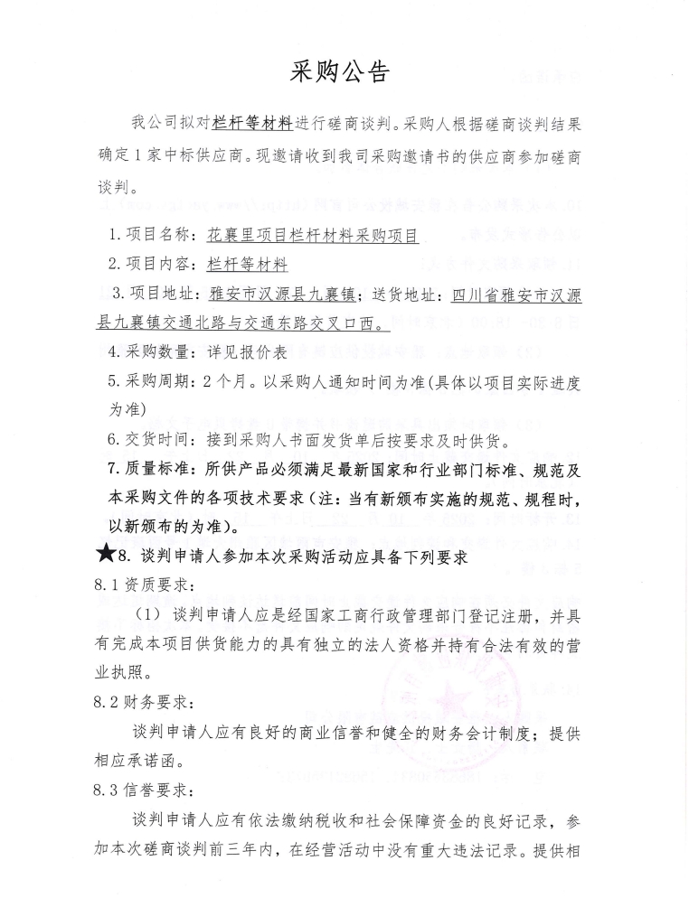 花襄里項目欄桿等材料談判磋商采購公告